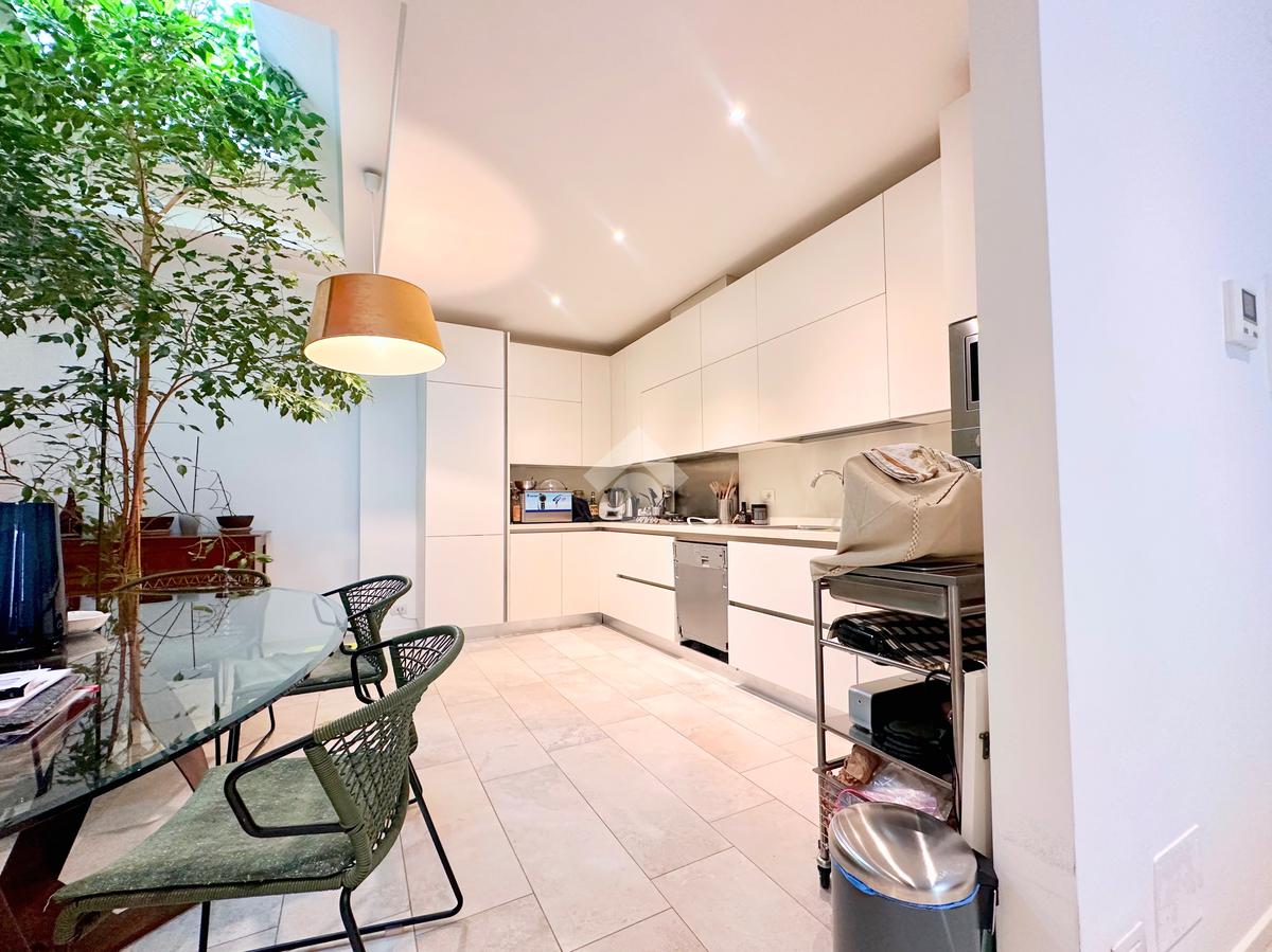 La zona giorno è composta da un ampio open space con cucina e soggiorno integrati, caratterizzati da un ambiente luminoso e moderno. La cucina è valorizzata da un velux caratteristico che dona luce naturale e un tocco di originalità all’ambiente.